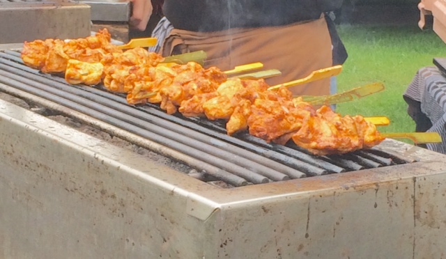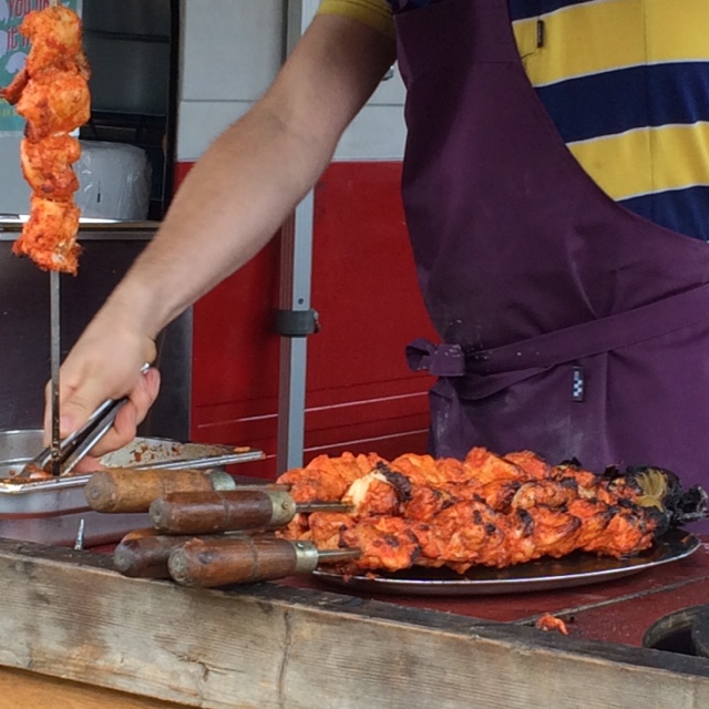 Ayam di truck makanan India. Ketika saya mengambil foto ayam ini, saya tidak tahu kalau Mas yang pegang ayamnya sedang tersenyum dan berpose. Dipikir saya sedang mengambil gambar utuh. Karenanya ketika saya selesai dan mengucapkan terima kasih, dia tersenyum sumringah. Baru tahu ketika suami cerita dengan tertawa ketika kami sudah melangkah menjauh kalau Mas tadi pose dan tersenyum. Saya jadi merasa bersalah hanya membidik ayamnya saja. Tapi tetap saya tertawa terpingkal.