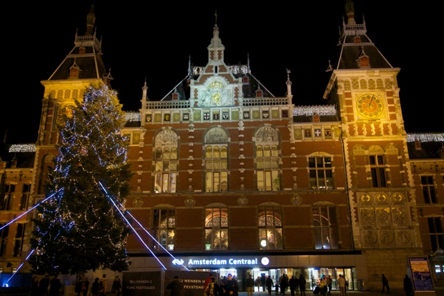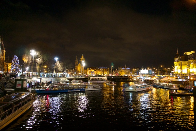 Kami sampai di Amsterdam Centraal pukul 17.30 pada hari Natal kedua. Niatnya ingin melihat instalasi menggunakan perahu. Apadaya ternyata tiket untuk semua perusahaan perahu ludes terjual. Salah kami juga memutuskan untuk naik perahu didetik-detik terakhir akan pergi. Kalau naik perahu, menyusuri kanal untuk melihat Water Colors ditempuh selama 75 menit dengan membayar €20/orang. Jadi kalau tahun depan ada yang berencana melihat Amsterdam Light Festival, lebih baik membeli secara online jauh hari supaya tidak kehabisan.