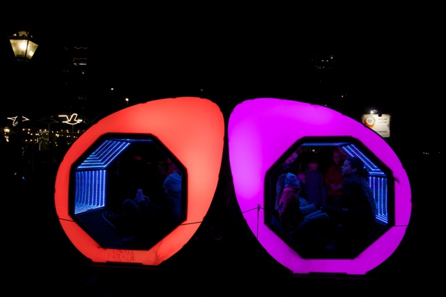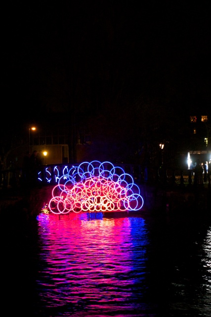 Akhirnya kami memutuskan untuk mengambil rute Illuminade yaitu berjalan kaki menyusuri kanal. Berbekal buku panduan yang dibeli suami dipusat informasi seharga €3.5 kami tidak hanya menyusuri kanal sesuai dengan rute kapal, tetapi bisa juga singgah dibeberapa taman yang ada instalasi lampunya. Salah satu yang bisa ditemui di Illuminade adalah Instalasi Infinitive Support. Menurut Lightform sebagai penggagasnya, Infinitive Support mempunyai makna “To us, friendship means supporting one another through thick and thin. As far as we’re concerned, friendship is never ending.