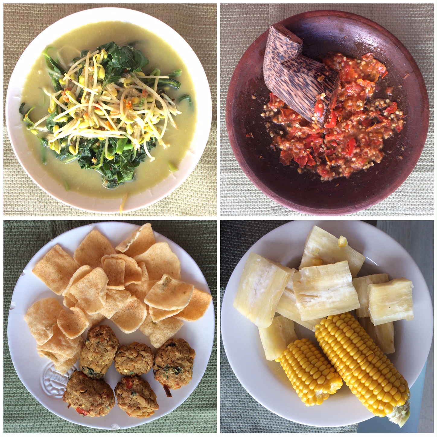 Sayur bobor yang dimakan bersama singkong kukus, jagung kukus, mendol panggang, sambel trasi mentah, dan kerupuk. Makan ini berasa lagi ada di Indonesia