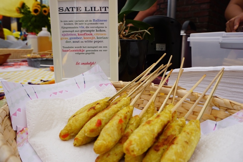 Beberapa minggu lalu, saya pernah memamerkan foto ke dia saat saya berhasil untuk pertama kalinya membuat sate lilit Bali dan sate ayam. Saat itu saya bilang kalau nanti ke Horst, saya akan membawa sate lilit untuk dimakan bersama di rumahnya bersama 3 teman lainnya. Saya tidak menyangka kalau membuat sate lilit begitu mudah. Saya pikir selama ini agak ruwet, ternyata gampang sekali dan prosesnya cepat. Hari jumat sepulang kerja, saya bilang ke dia kalau sate lilit siap diproses dan meminta dia untuk mempersiapkan sambel matah sebagai teman makan sate lilit. Ternyata dia memberikan ide, bagaimana kalau saya membuat sate lilit dengan porsi yang lebih banyak supaya bisa dijual di stan dia. Wah, dadakan sekali karena saya tidak terlalu cukup bahan juga. Tetapi sayang juga ya kalau dilewatkan. Kesempatan emas untuk memperkenalkan sate lilit kepada orang Belanda karena di Belanda yang terkenal adalah sate ayam. Akhirnya saya membuat sate lilit dengan bahan yang ada saat itu. Saat saya memberitahu suami, dia ikut antusias juga sampai membuatkan deskripsi sate lilit itu apa. Dia sampai menawarakan untuk membuatkan saya kartu nama, siapa tahu ada yang mau pesan katanya. Walah, saya sampai tidak berpikir sepanjang itu karena untuk saat ini memasak itu bagian dari hobi meskipun beberapa kali juga saya memasak pesanan dari teman-teman dekat suami dan saya.