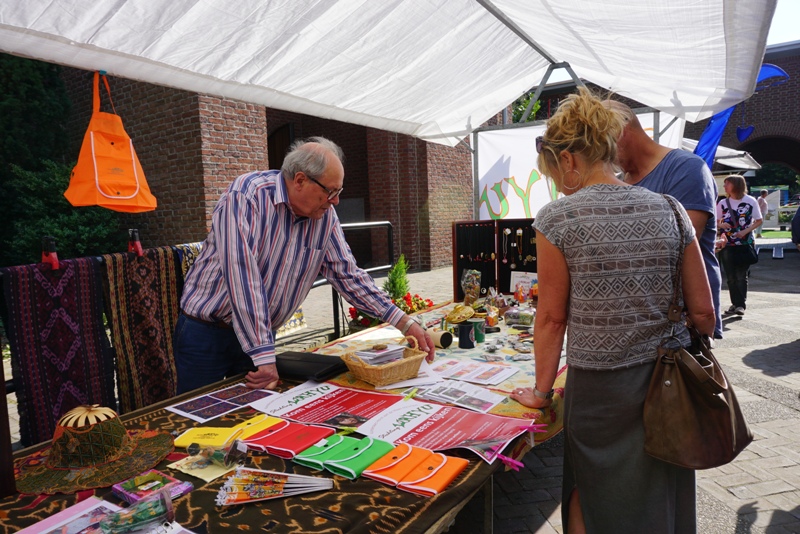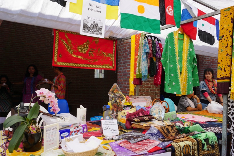Setelah 2.5 jam perjalanan, sampai juga saya di Stasiun Horst-Sevenum (Suami tinggal di rumah. Setiap bulan kami memang selalu ada me time sehari melakukan kegiatan sendiri-sendiri). Saya dan seorang teman dijemput lalu kami langsung menuju ke tempat acara. Teman saya bersama teman lainnya sudah ada di stan. Teman yang tinggal di Amsterdam membawa barang jualannya yaitu batik-batik. Sedangkan teman saya yang di Horst menjual lumpia lalu saya menjual sate lilit. Saya antusias sekali selain karena bertemu dengan mereka, juga pertama kali ikut dalam acara lokal seperti ini. Sebenarnya suami sudah menawarkan beberapa kali untuk ikut serta di festival kuliner yanga ada di Den Haag, tapi saya masih males-malesan menyanggupi. Suami saya ini memang selalu berapi-api kalau mendukung saya untuk usaha makanan. Tapi saya masih belum sepenuh hati, meskipun cita-cita besar saya di masa depan ingin punya restoran yang dipadukan dengan toko buku atau perpustakaan. Mudah-mudahan terwujud. Saya dan teman-teman menggunakan batik, nyambung dengan apa yang dijual di stan tersebut.