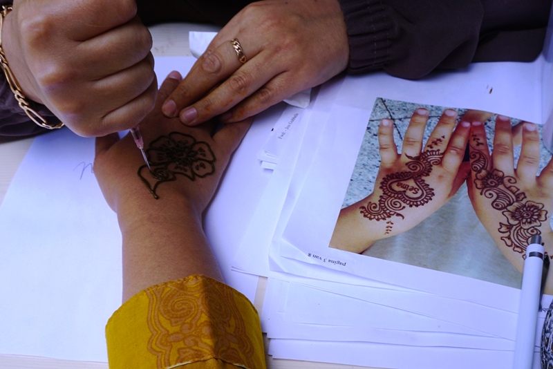 Saya dan teman-teman juga berkesempatan membuat Henna. Awalnya melihat ada seorang perempuan membuat Henna untuk anak kecil. Lalu saya bertanya harus bayar berapa dan tahan berapa lama Henna tersebut. Ternyata gratis dan cuma tahan kurang lebih satu minggu. Saya lalu tertarik lalu minta dibuatkan salah satu model yang tertera di salah satu bukunya. Sambil menunggu dilukis, saya bisa mendengarkan alunan gendang (entah apa nama alat semacam gendang) yang dimainkan dari stan Afrika dan beberapa orang ikut belajar memukul gendang tersebut. Begitu sampai rumah, suami kaget ada Henna di tangan saya. Saya suka karena gambarnya tidak ramai. Sampai hari ini, Henna yang ada di tangan sudah agak memudar.
