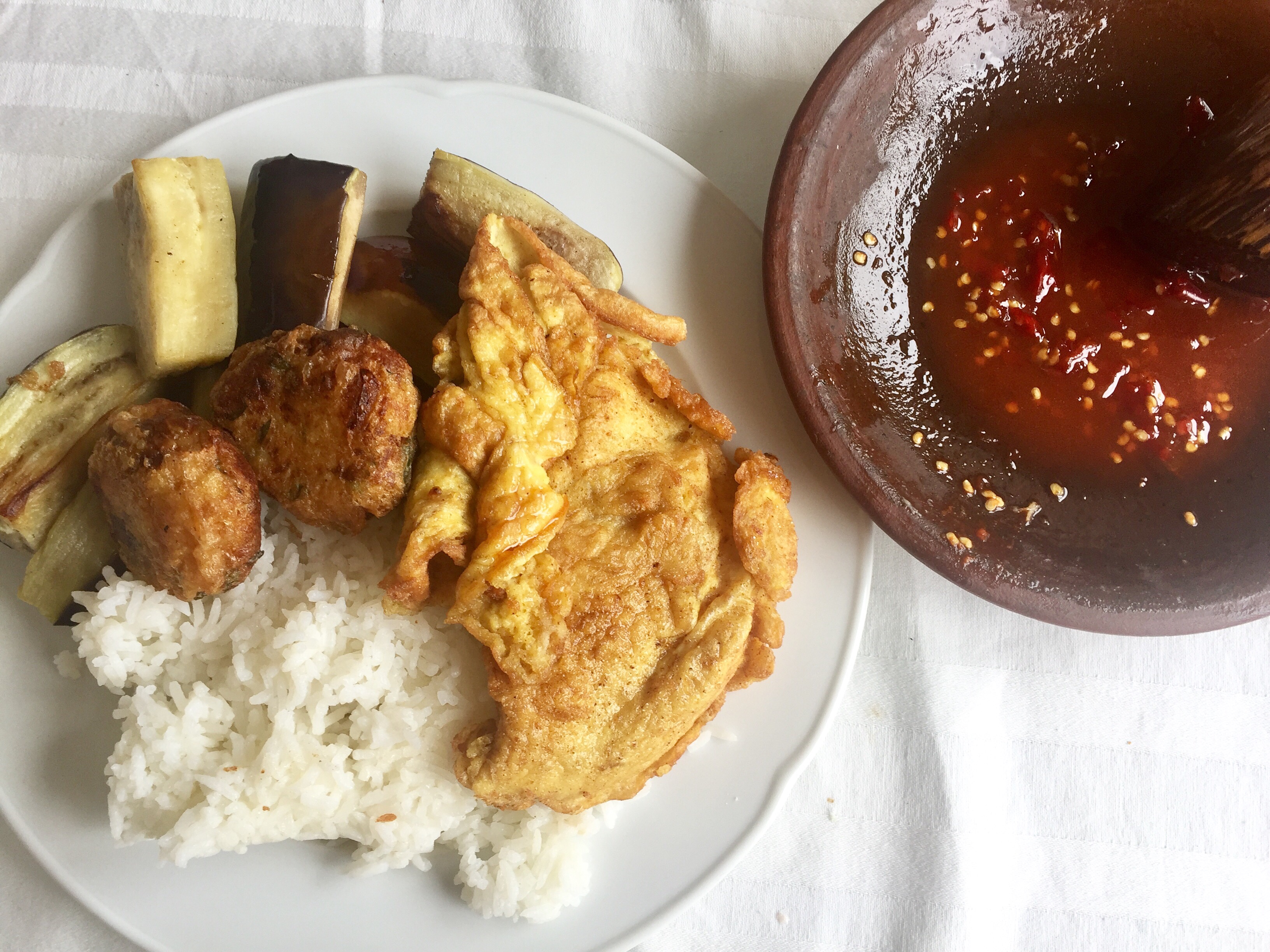 Menu makanan favorit saya. Terong goreng, perkedel, telor dadar dan sambel petis Madura. Menu seperti ini selalu mengingatkan masa ngekos di Surabaya. Hampir selalu makan malam di warung penyetan. Bedanya di sambel saja. Ahhh saya jadi kangen warung penyetan di sekitar kampus (dekat Sakinah)