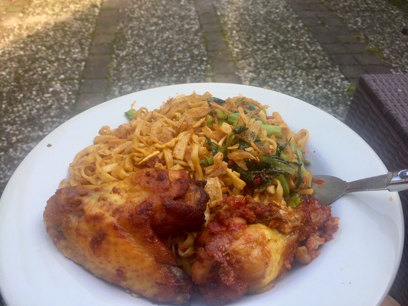 Sepanjang minggu bisa makan di halaman belakang. Ini makan pakai ayam panggang dan sisa bumbunya dipakai untuk masak Mie goreng