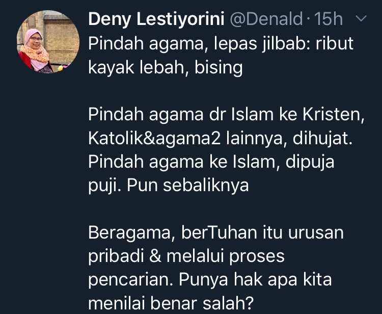 Beragama, berTuhan, memilih tidak beragama dan mempercayai selain Tuhan, semuanya berproses, melalui perjalanan panjang, pergolakan batin, pengalaman hidup yang sifatnya sangat individu dan menjadi urusan pribadi. Kecuali kita ada di sana saat seseorang memutuskan berpindah (apapun konteksnya), kita tidak pernah tahu pergumulan seperti apa yang terjadi sebelumnya. Kita tidak punya hak menghakimi. Memutuskan berjilbab, melepas jilbab, semuanya pun berproses. Mereka melewati sebuah perjalanan dan proses batin yang kita tidak tahu seperti apa. Kita tidak berhak untuk menghakimi.
