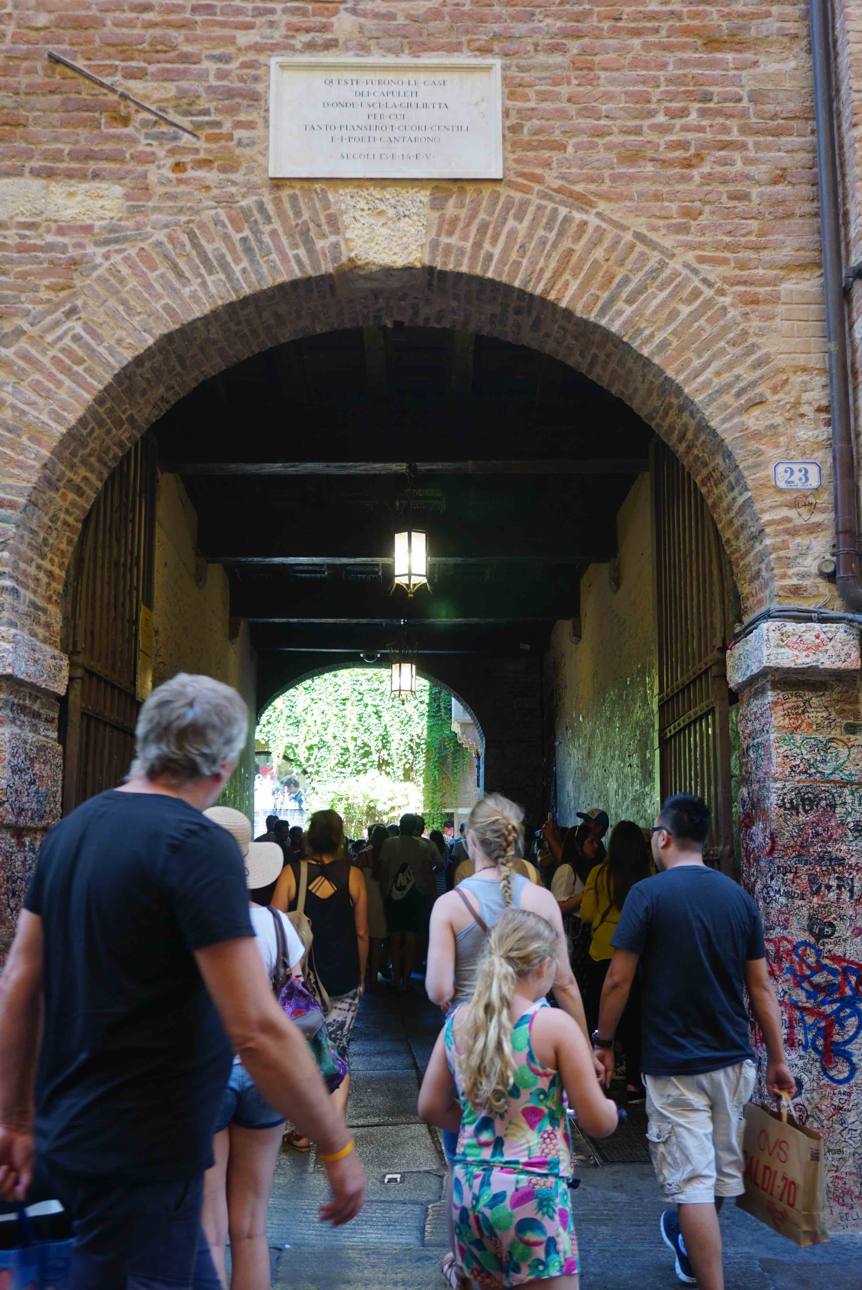 Niatan awal mengunjungi Verona karena ingin napak tilas segala yang ada di film kan, jadinya wajib mengunjungi Rumah Juliet ini. Pada gerbang masuknya, di dinding kanan kiri, banyak sekali coretan. Mungkin memang disediakan untuk dicorat coret. Di halaman, penuh sekali wisatawan yang ingin melihat seperti apa sih balkon yang konon ada di bagian cerita Romeo and Juliet. Setiap ada yang muncul di balkon, orang-orang yang di bawah langsung melambaikan tangan pada orang yang di balkon haha agak lucu juga jadinya. Padahal ya mereka tidak saling kenal. Suami lalu menyuruh saya untuk masuk ke dalam dan naik sampai balkon. Saya awalnya ragu karena kok agak malu ya dadah-dadah dari atas haha. Karena suami bilang nanggung sudah sampai sini tidak naik sampai balkon. Saya pikir, iya juga.