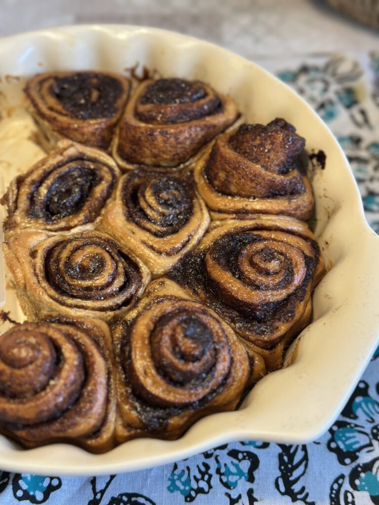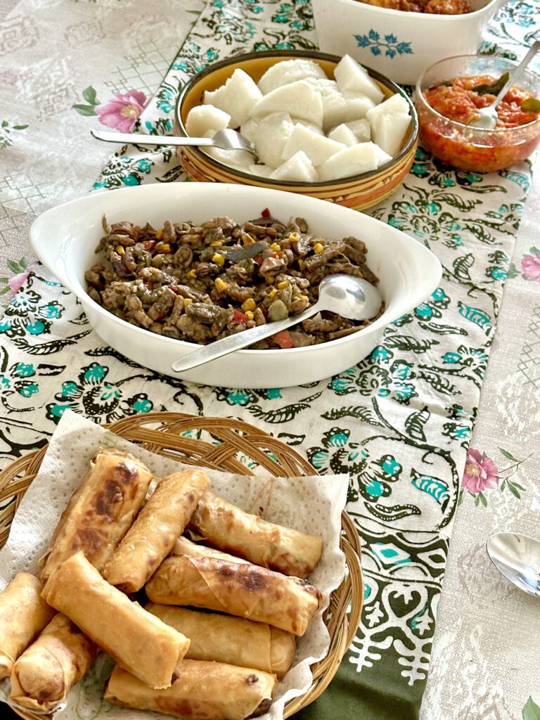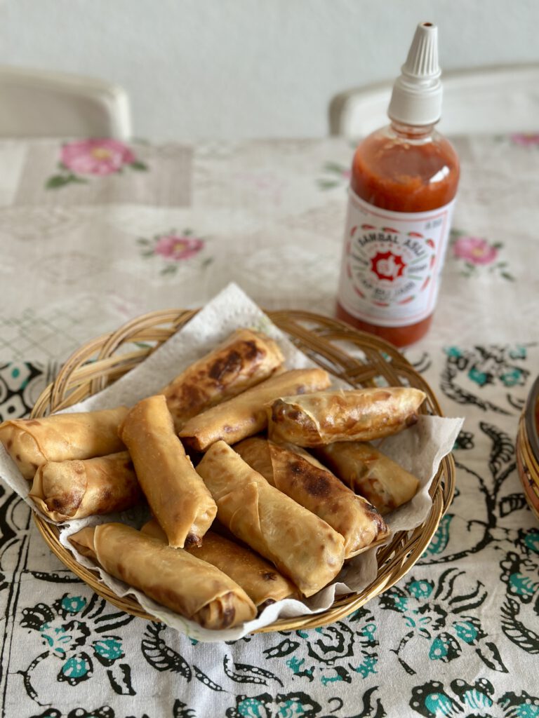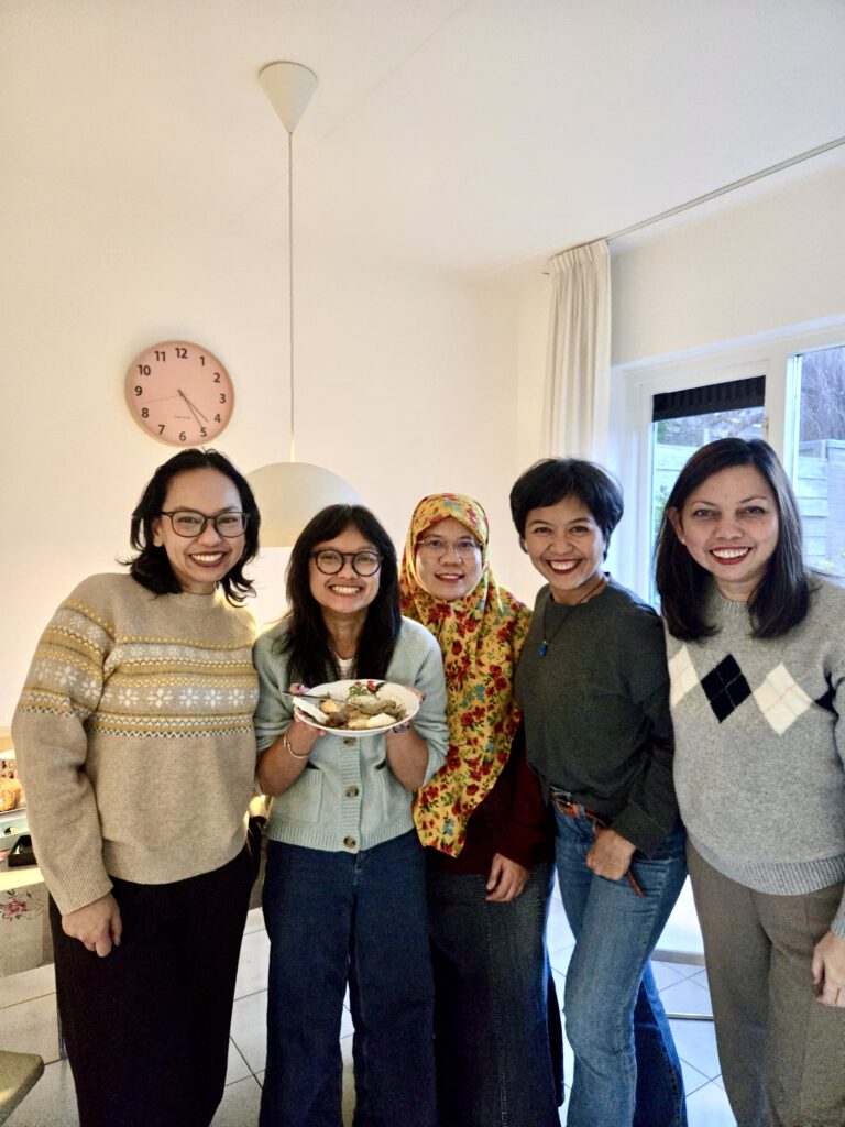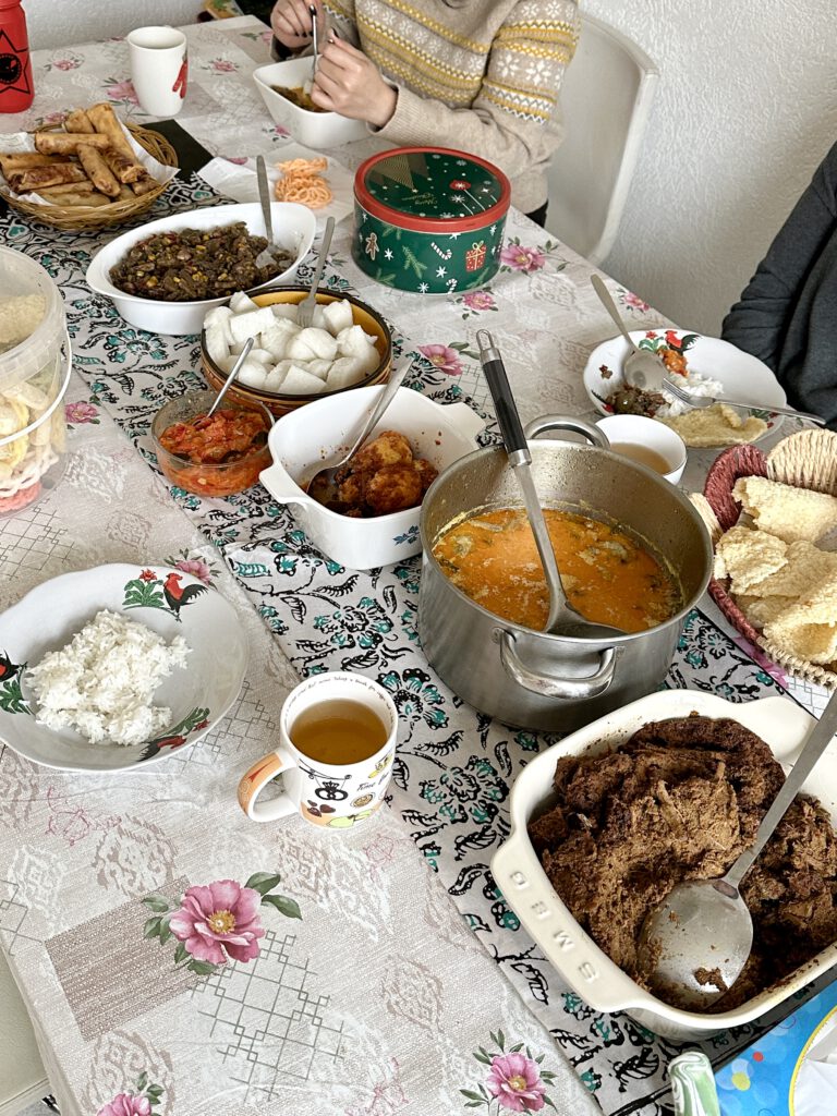 Saya memasak rendang 3.5kg, oseng cumi asin pedas, lumpia rebung semarang, chocolate banana cake, bikin lontong, goreng kerupuk, dan membuat sourdough cinnamon roll. Anis membawa lontong sayur dan teh jasmin juga kado untuk anak – anak kami plus chips, Ajeng membawa telur balado, Agnes membawa brownies dan coklat cantik (tidak sempat difoto), Dita yang datang belakang membawa wedangan dan pesanan kami dari Indonesia (Dita baru saja kembali dari mudik).