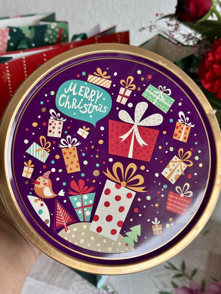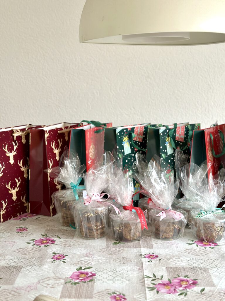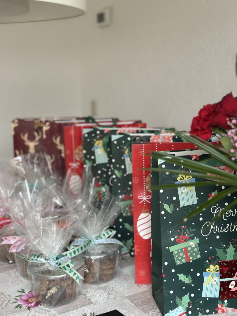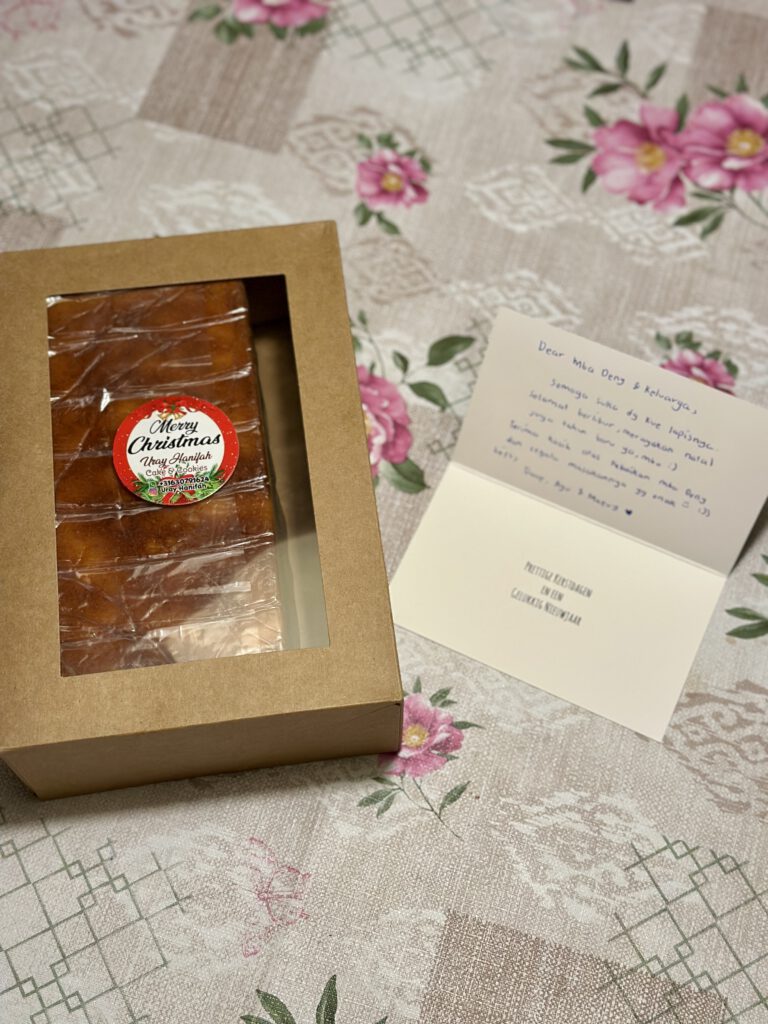 Setiap tahun saya pasti memberikan bingkisan ke para guru anak – anak di kelas dan guru les mereka. ini sifatnya tidak wajib ya, memang inisiatif sendiri. Ada beberapa orang tua lainnya pun memberikan bingkisan. Di dalam bingkisan ini, yang kami berikan juga bukan barang mewah. Danish cookies yang saya beli di Supermarket. Cookies dan brownies buatan saya sendiri. Lalu kartu ucapan Natal dan tahun baru yang di dalamnya ada tulisan anak – anak dan gambar mereka. Saya mengemas bingkisan ini dengan plastik dan saya hias supaya terlihat cantik. Lalu saya taruh bingkisan ini di tas kertas bertema Natal. Wah saya senang lihatnya. Tiap guru yang diberi pun gembira.