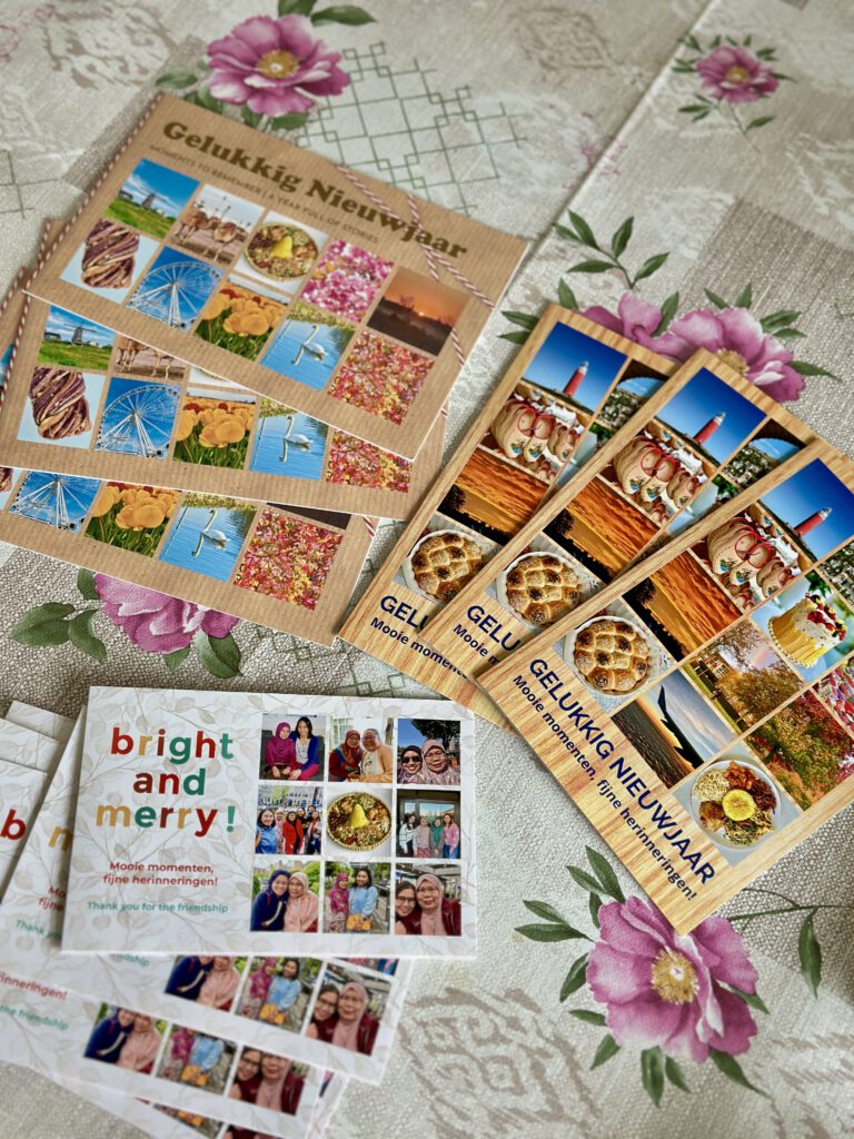 Seperti biasa tiap akhir tahun, budaya di Belanda adalah saling berkirim kartu ucapan Natal dan Tahun Baru. Tahun ini, ada yang berbeda dari kartu ucapan yang saya kirim ke beberapa teman di Belanda dan di Indonesia. Banyak waktu karena sedang libur medsos an, saya manfaatkan dengan membuat sendiri kartu ucapan yang menampilkan foto hasil karya saya sendiri. Selain itu, saya membuat kartu ucapan khusus untuk beberapa teman dekat di Belanda. Ditambah memang ada program diskon dari tempat mencetak kartu ucapan tersebut. Jadi saya manfaatkan dengan maksimal. Saya puas dengan hasilnya yang cantik. Teman – teman yang menerima juga memberikan pujian dengan kartu ucapan ini. Untuk saudara dan tetangga, kartu ucapan yang dikirimkan, beli di toko saja haha. Ya nanti kalau pakai versi saya, tidak paham karena ada bahasa Indonesianya.